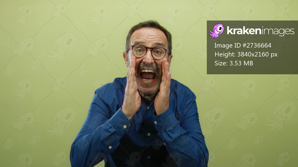 Senior man gestures passionately on an isolated yellow background wearing glasses and blue shirt
