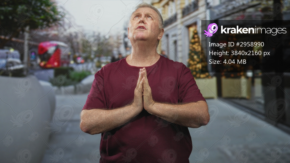 Senior man with hands pressed in prayer at chest on a busy city street sidewalk beside a storefront and christmas tree, looking upward in maroon shirt; faith hope. - Kraken Images