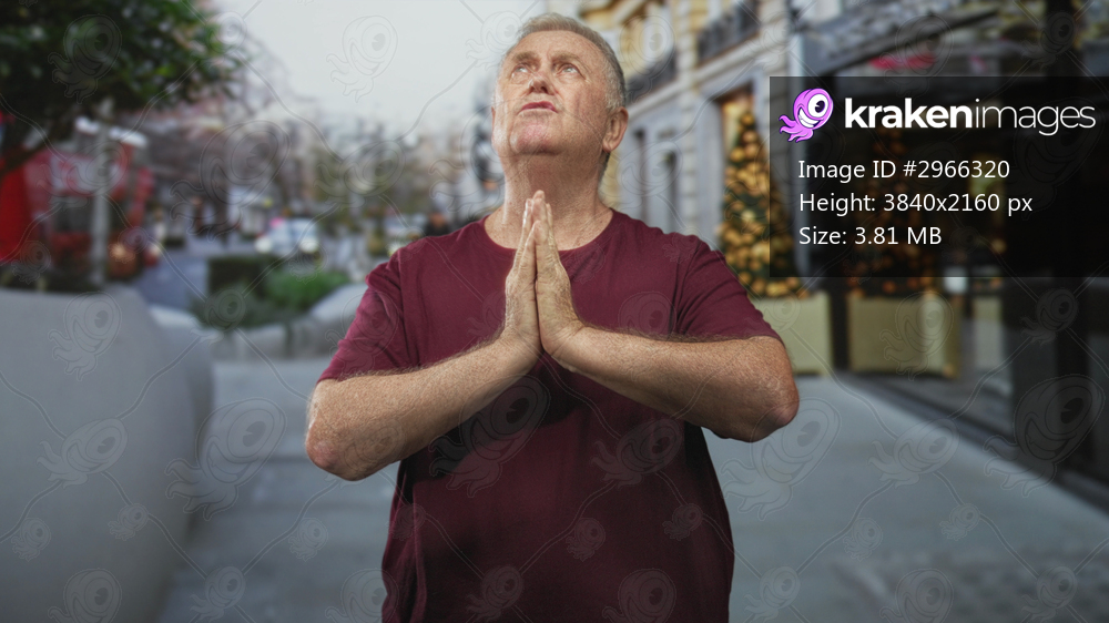 Senior man with hands pressed in prayer at chest on a busy city street sidewalk beside a storefront and christmas tree, looking upward in maroon shirt; faith hope. - Kraken Images
