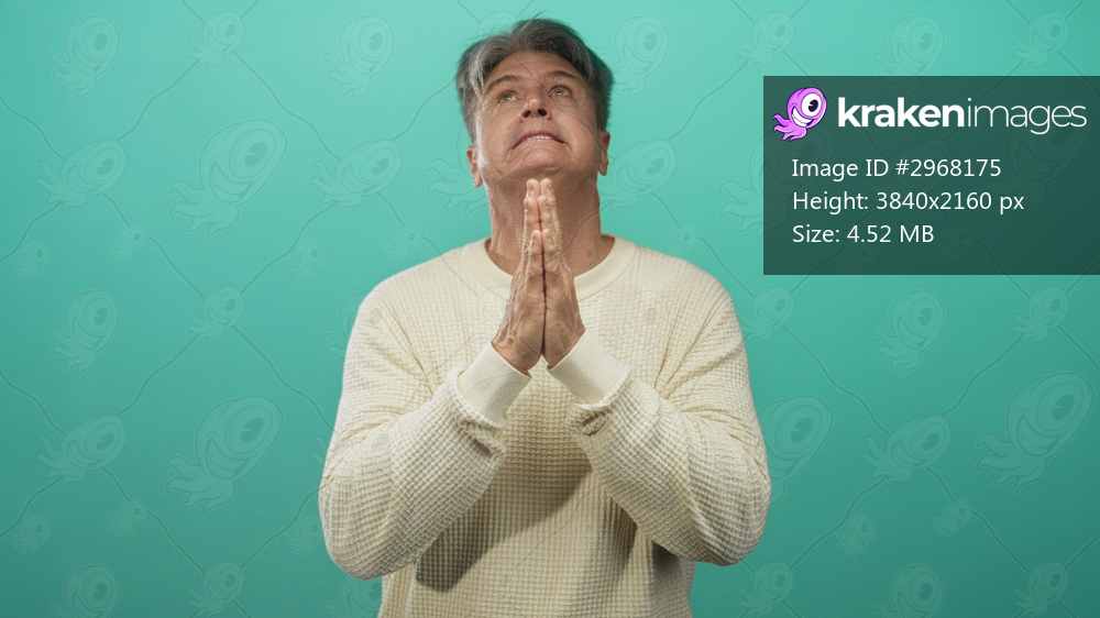 Senior man with hands pressed together in prayer gesture in studio teal backdrop, eyes closed and head bowed; quiet contemplation serenity.