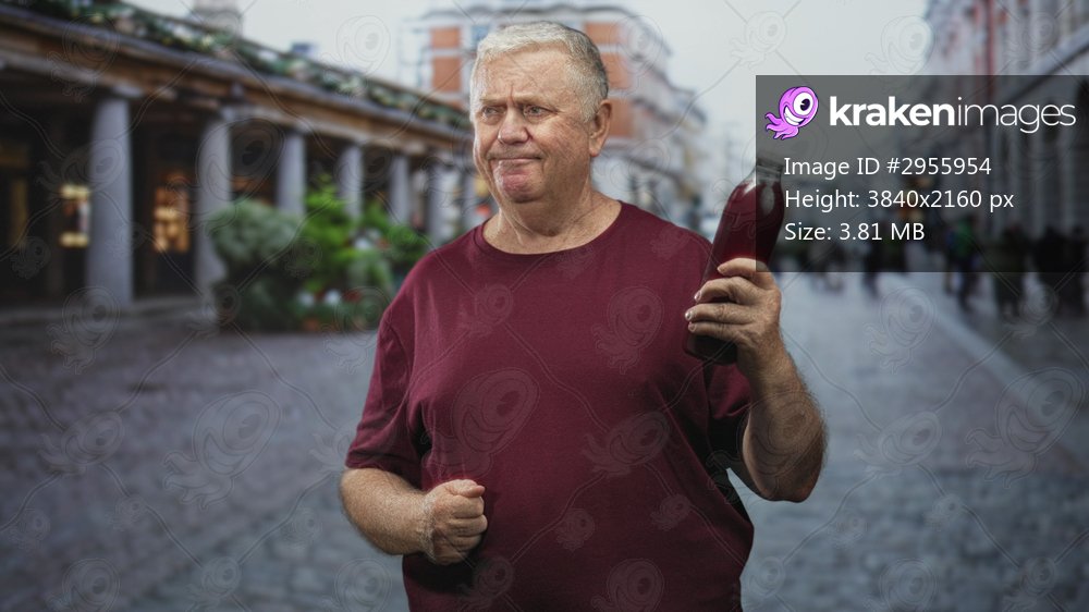 Senior man holding a bottled pomegranate juice inspects the sealed cap and label on a cobblestone street with a puzzled expression; doubt.
