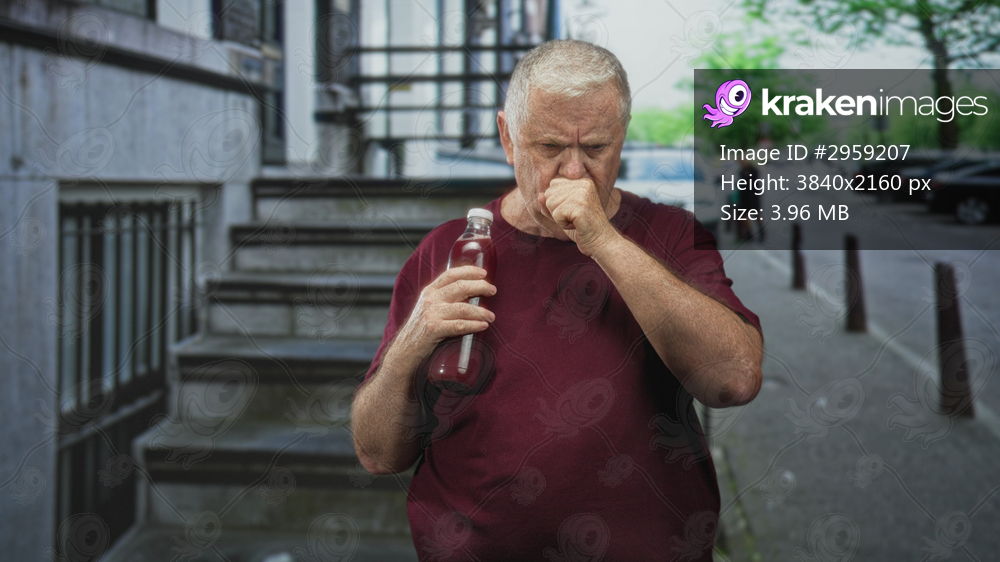 Senior man holding a pomegranate juice bottle with hand covering nose on street near concrete steps and parked cars; nausea concern health.