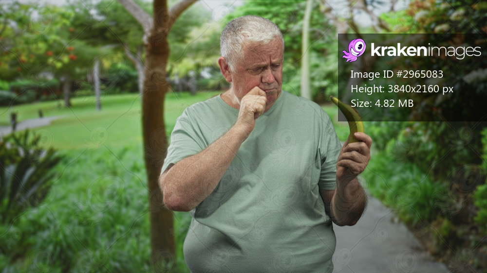 Senior man holding banana with hand to mouth gesture in forest path, inspecting fruit; confusion hesitation health concern.