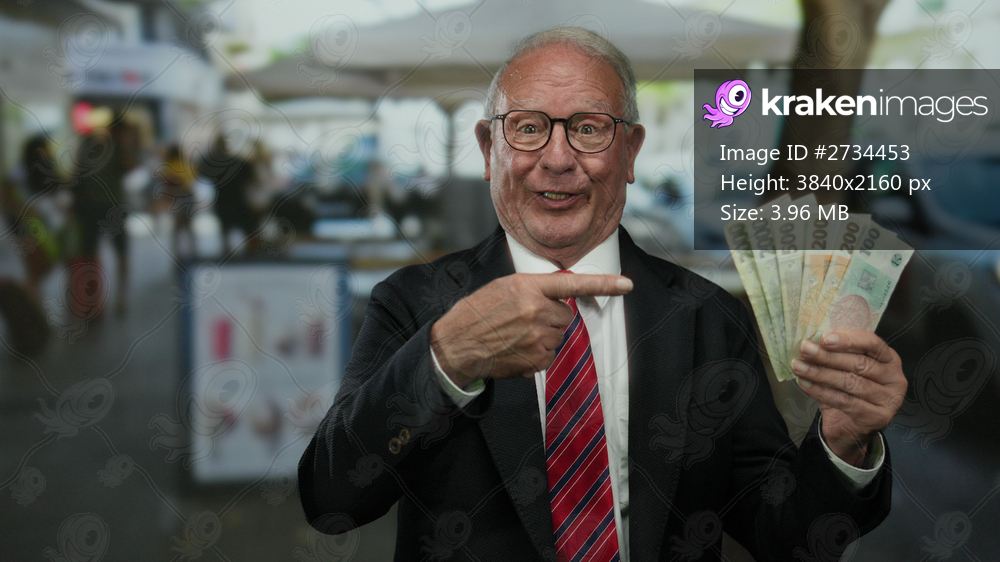 Senior man holding czech koruna banknotes on a lively terrace in a bustling outdoor street restaurant setting, expressing joy in a business context.