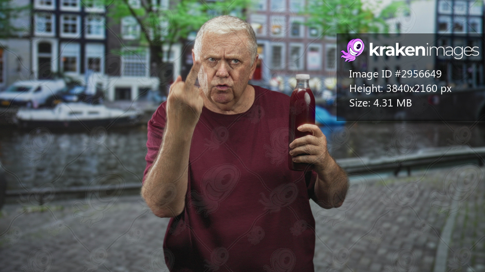 Senior man holding pomegranate juice bottle shows middle finger on canal street while facing camera; defiance rebellion.