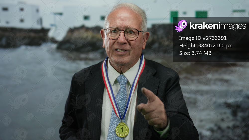 Senior man in a business suit with a medal points confidently while standing seaside, depicting outdoor success and leadership at the beach.