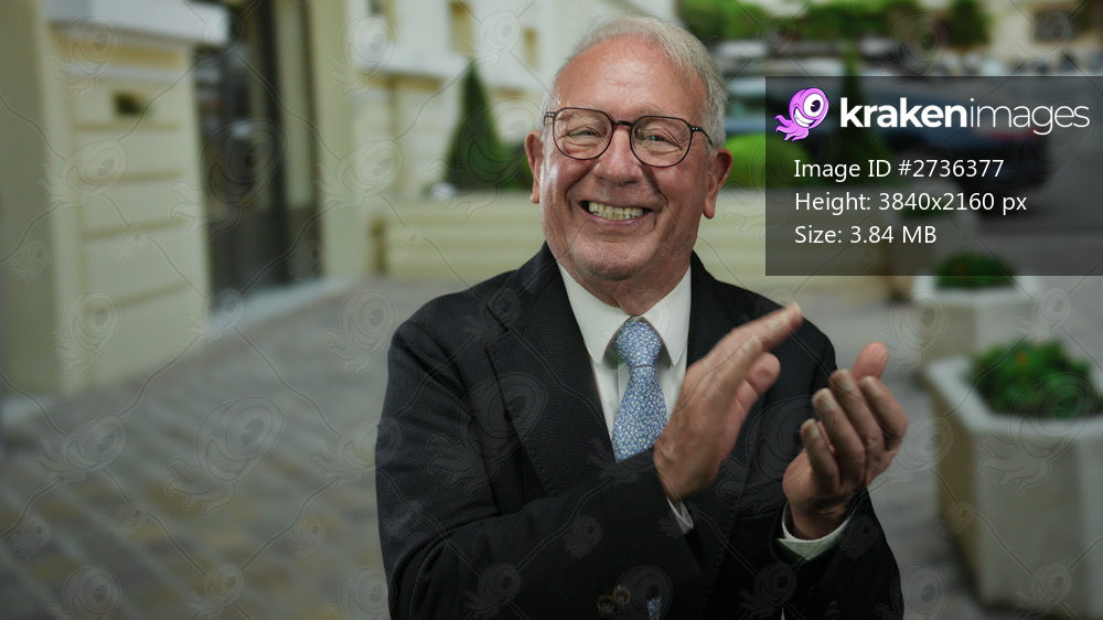 Senior man in a business suit clapping on an outdoor city street, exuding a joyful expression amidst urban surroundings and modern architecture.