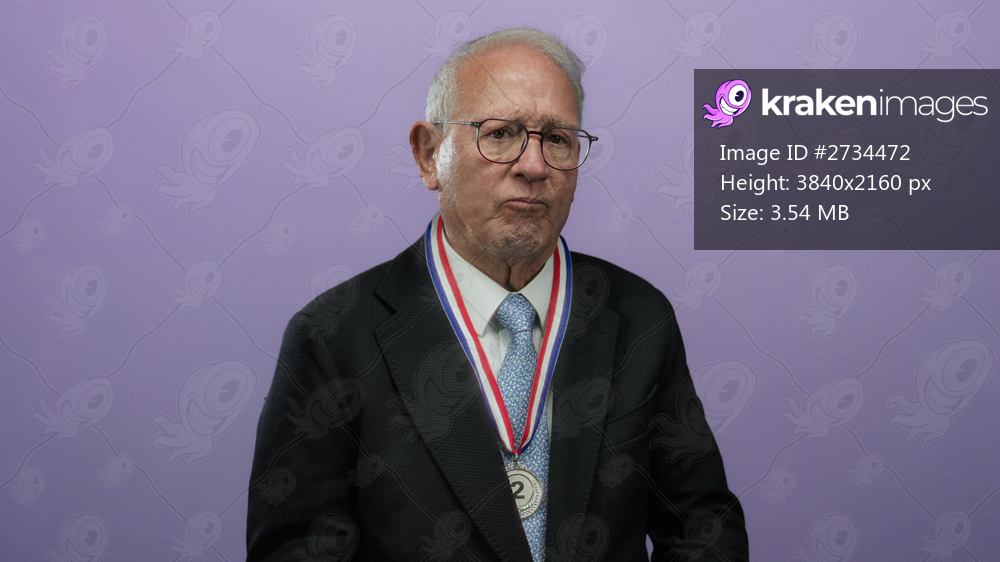 Senior man in a business suit with glasses and a medal stands against an isolated purple background wall, conveying emotion and introspection.