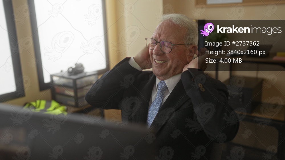 Senior man in a business suit holds his neck in pain while sitting in an office, surrounded by books and a computer, under bright indoor lighting.