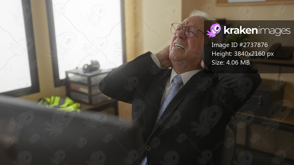Senior man in a business suit holds his neck in pain while sitting in an office, surrounded by books and a computer, under bright indoor lighting.