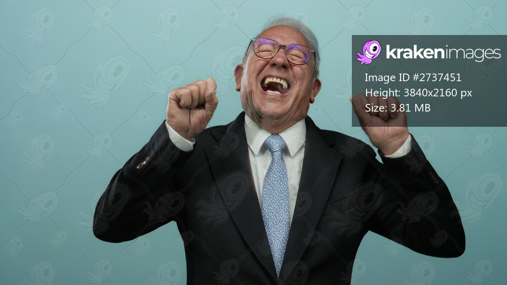Senior man in a business suit joyfully laughing against a blue background, displaying a positive and charismatic demeanor.