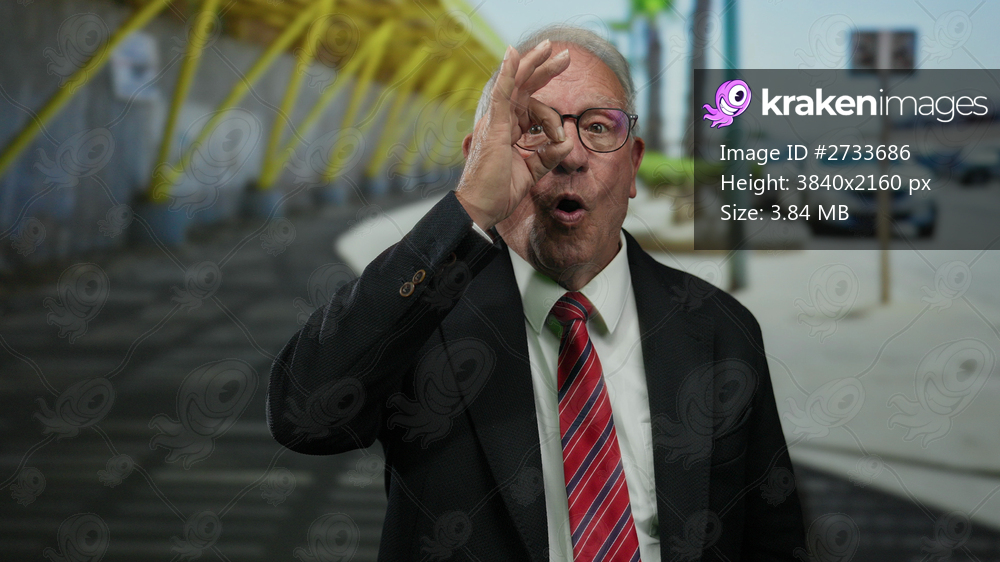 Senior man in a business suit on the street makes an okay gesture while smiling in an outdoor setting.