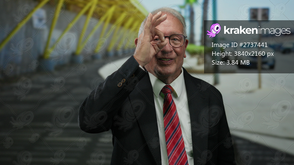 Senior man in a business suit on the street makes an okay gesture while smiling in an outdoor setting.