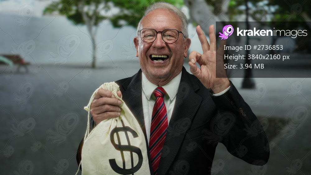 Senior man in a business suit outdoors holding a money bag with a dollar sign, smiling and showing the ok gesture on a street, implying themes of success or corruption. - Kraken Images