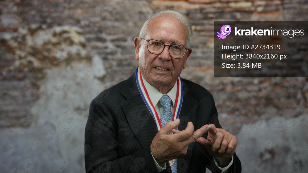 Senior man in a business suit poses against an isolated brick background wearing glasses and a medal, showcasing a thoughtful expression.