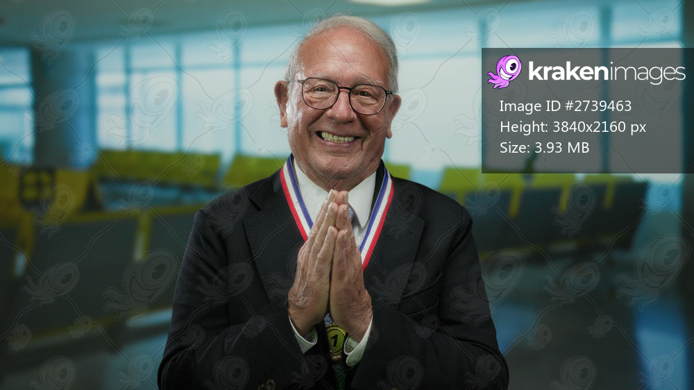 Senior man in a business suit smiling with hands clasped in an airport setting conveys a sense of gratitude and achievement.