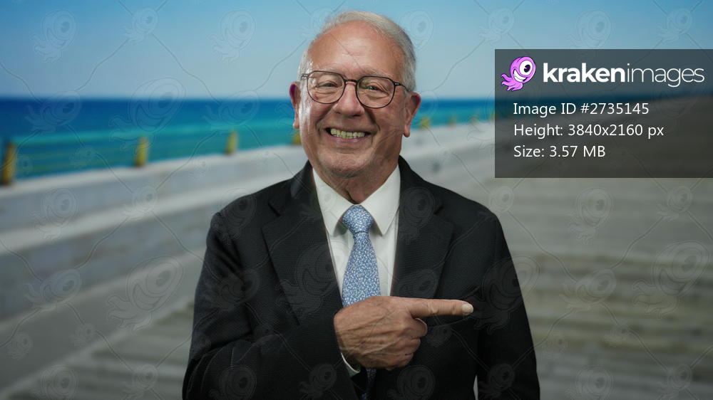 Senior man in a business suit smiling and making a gesture on a seaside promenade under a clear blue sky, capturing a moment of outdoor confidence and success. - Kraken Images