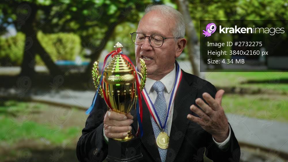 Senior man in a park wearing a business suit, holding a trophy with a gold medal around his neck and showing pride, surrounded by green trees and outdoor scenery. - Kraken Images
