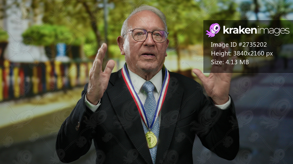 Senior man in a suit with a medal gestures passionately outdoors in a sunny park setting, showcasing his achievement and success in a professional context. - Kraken Images