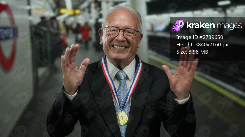 Senior man in a suit with a medal smiling at a train station, showcasing success and confidence.