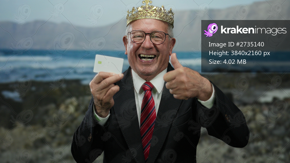 Senior man in a suit at the seaside gives a thumbs up while holding a card, wearing a crown with waves crashing in the background.