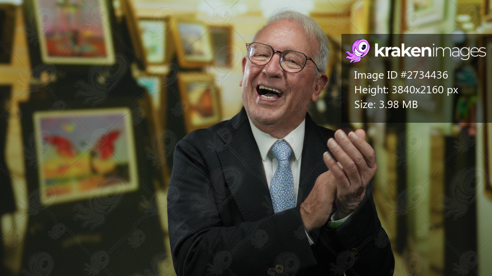 Senior man in a suit clapping with joy in an art gallery, surrounded by bright paintings, depicting a cheerful and cultured atmosphere indoors.