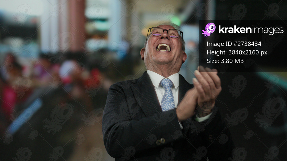 Senior man in a suit clapping joyfully at an outdoor restaurant terrace, capturing a lively street ambiance.
