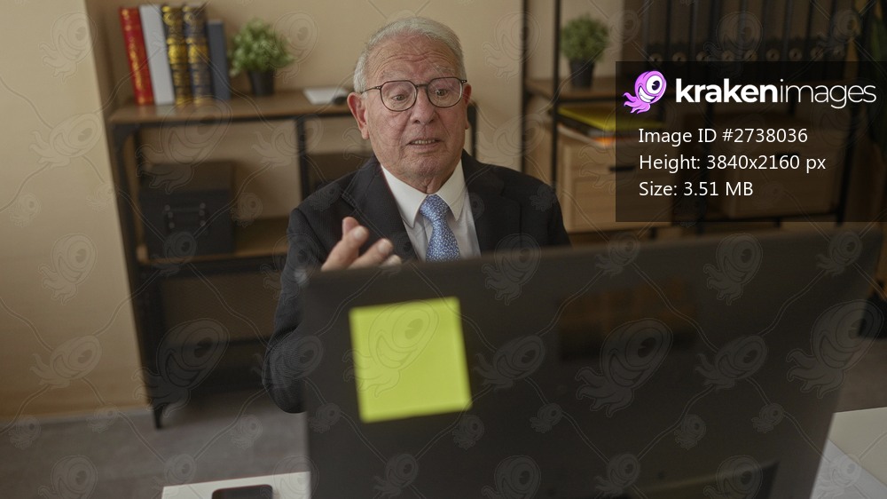 Senior man in a suit communicates via video call from an organized office interior, with shelves, books, and plants, enhancing his professional workplace environment. - Kraken Images