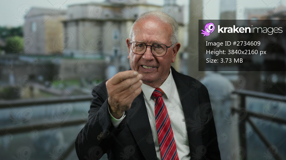 Senior man in a suit gesturing expressively against a backdrop of roman ruins during the day outdoors.