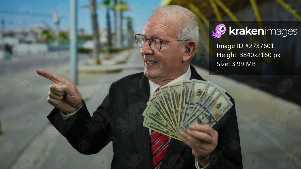 Senior man in a suit holding us dollars, gesturing on street with vibrant background showcasing urban environment, emphasizing wealth and business success outdoors. - Kraken Images