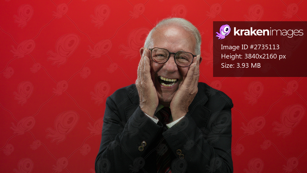 Senior man in a suit joyfully smiling against a vibrant red wall background, conveying happiness and confidence in a business setting.