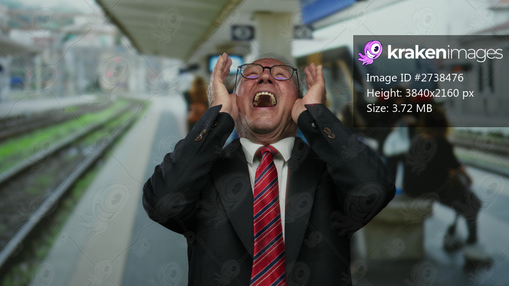 Senior man in a suit joyfully uncovers his face while smiling at a train station, showcasing a lively outdoor setting with blurred commuters and a train in the background. - Kraken Images