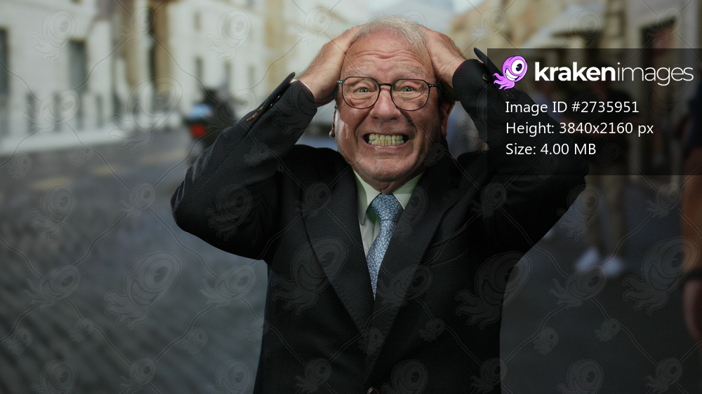 Senior man in a suit looks distressed on a city street, hands on head, displaying outdoor business environment with blurred urban background.