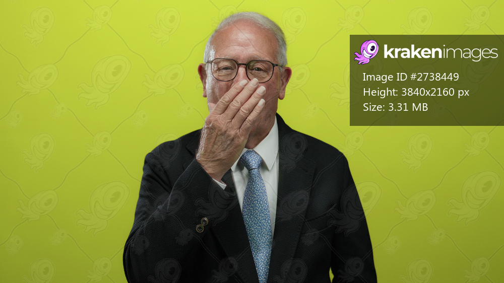 Senior man in a suit making a gesture in front of a vibrant yellow background, conveying emotions with a confident business style.