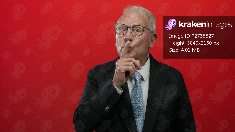 Senior man in a suit making a silence gesture against an isolated red background with a confident expression, portraying business secrecy and professionalism. - Kraken Images
