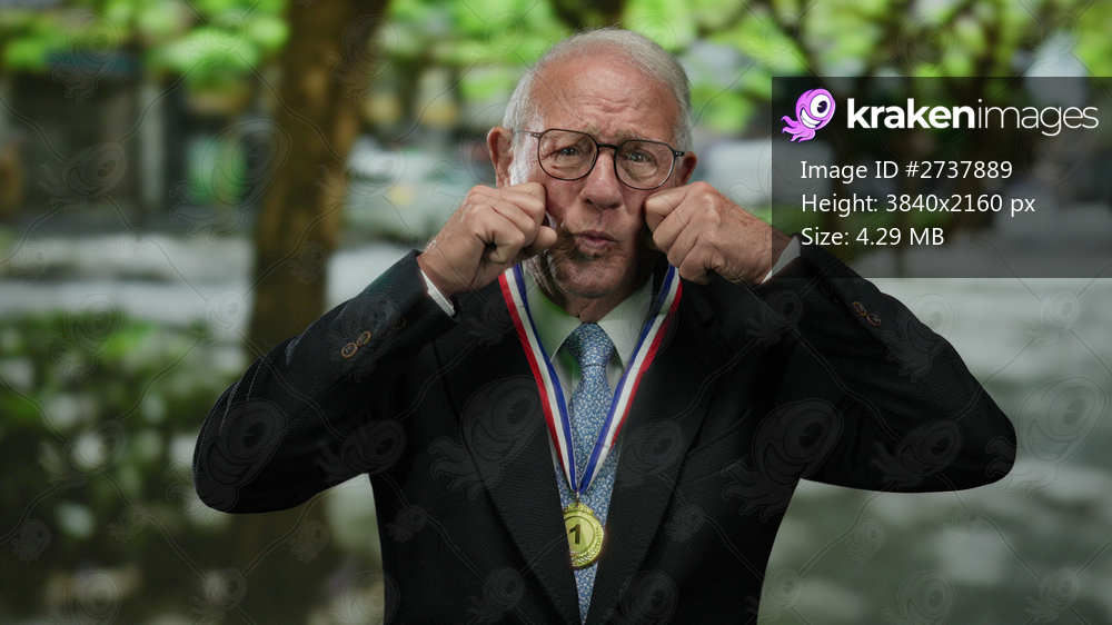 Senior man in a suit mimics crying with a gold medal in a park, capturing a poignant yet humorous moment that blends success with emotion against a serene outdoor backdrop. - Kraken Images