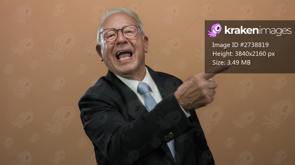 Senior man in a suit pointing and speaking energetically against a brown isolated wall background.
