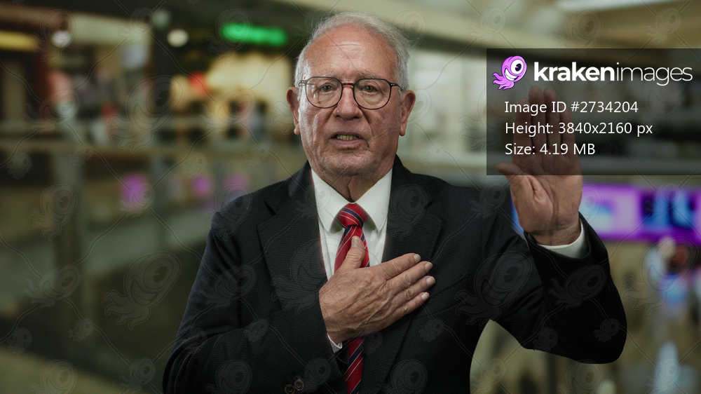 Senior man in a suit standing in a mall with one hand on his chest and the other raised, conveying a formal or solemn gesture.