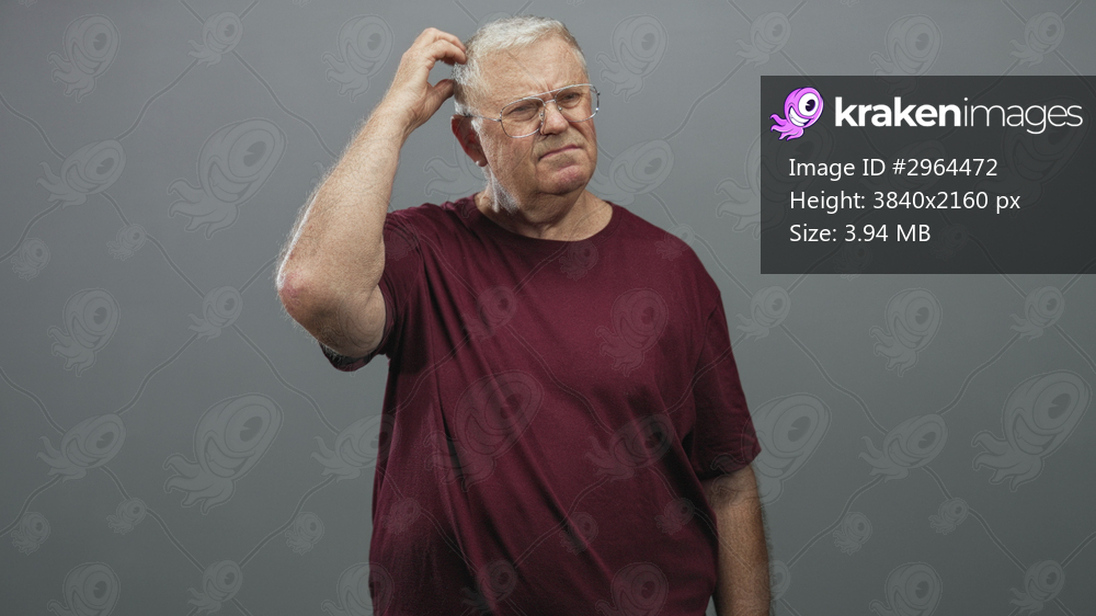 Senior man in burgundy t shirt scratching head with right hand while wearing glasses in studio grey wall setting; confusion reflection pondering.