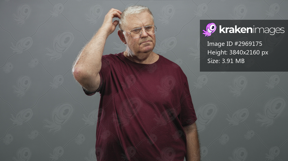 Senior man in burgundy t shirt scratching head with right hand while wearing glasses in studio grey wall setting; confusion reflection pondering.
