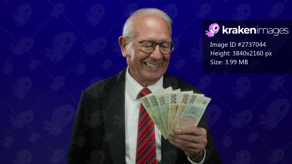 Senior man in business attire holds czech koruna banknotes against an isolated blue background, smiling as he admires the money.