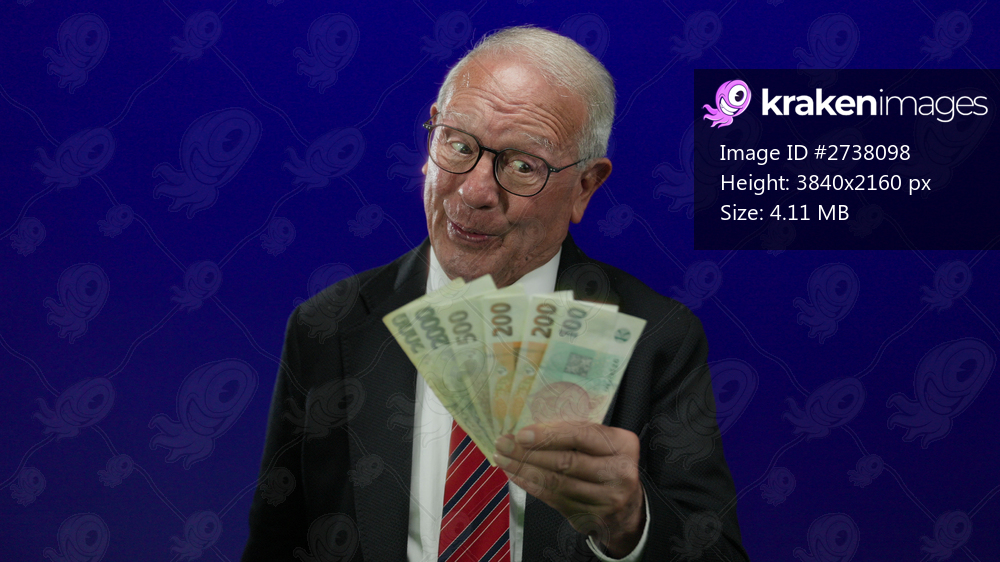 Senior man in business attire holds czech koruna banknotes against an isolated blue background, smiling as he admires the money.