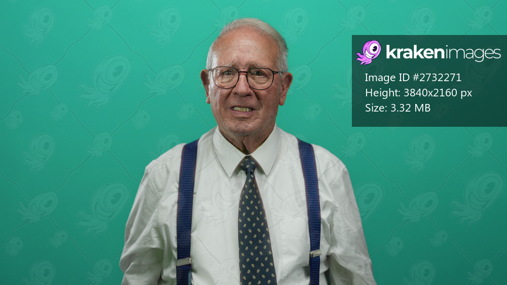 Senior man in business attire makes a fist over green background, wearing glasses, tie, and suspenders, expressing emotion in an isolated setting.