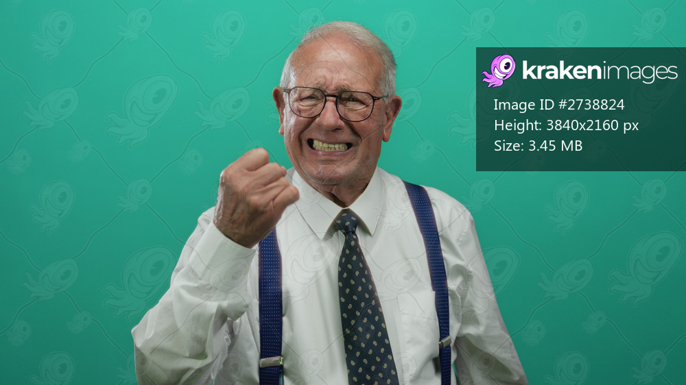 Senior man in business attire makes a fist over green background, wearing glasses, tie, and suspenders, expressing emotion in an isolated setting.