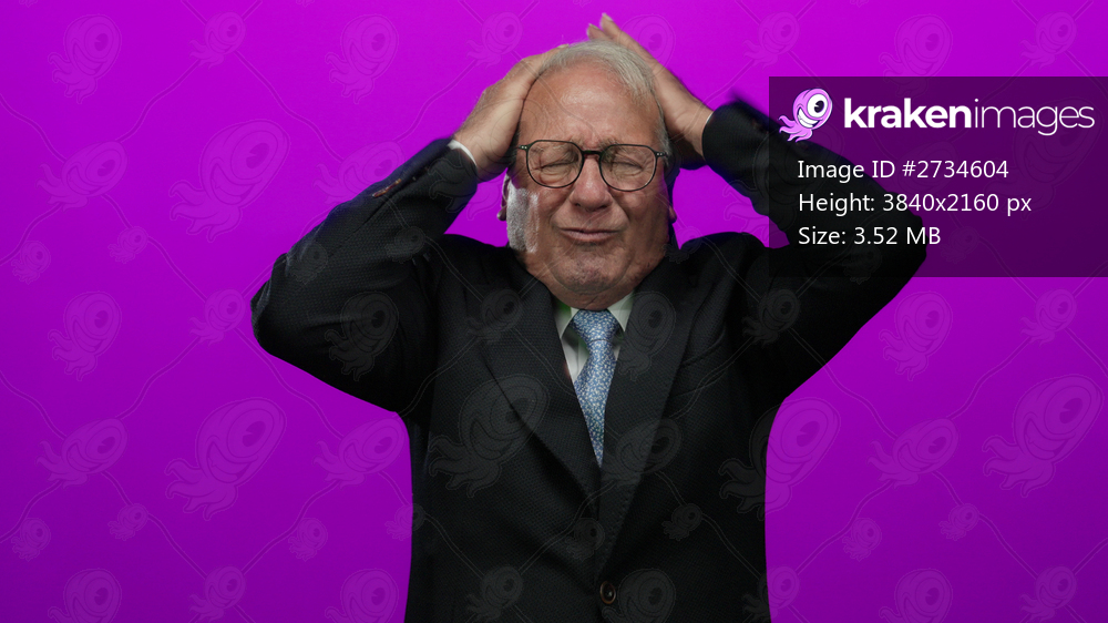 Senior man in business suit appearing desperate against isolated pink background, expressing intense emotions with gestures.