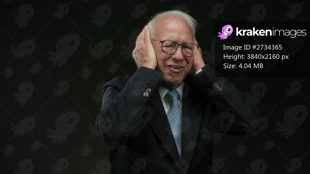 Senior man in business suit covers ears against isolated black background, expressing discomfort or frustration with eyes closed, illustrating a powerful human emotion. - Kraken Images