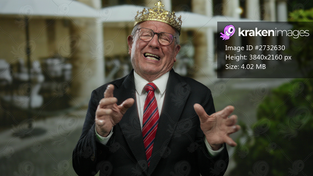 Senior man in business suit with crown appears emotional on a restaurant terrace, showcasing gestures in an outdoor street setting.