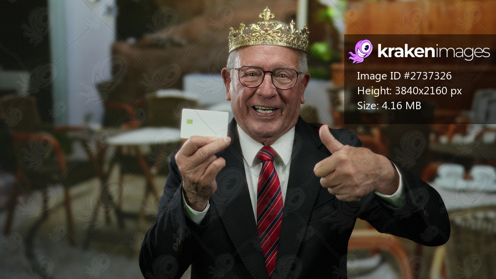 Senior man in business suit and crown holding card and giving thumbs up in restaurant setting.