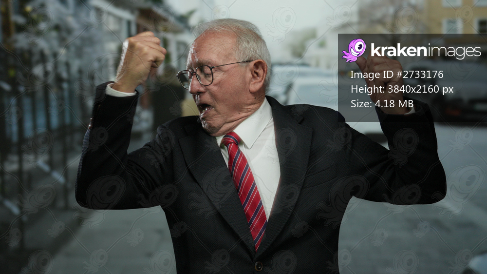 Senior man in business suit expressing excitement on outdoor city street with arms raised, embodying a vibrant sense of success and accomplishment.