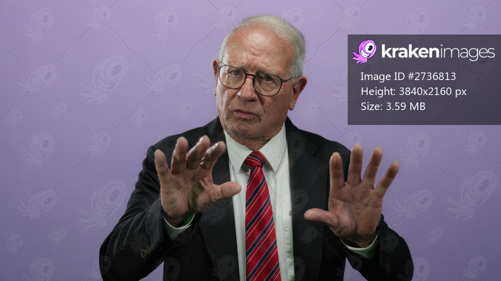 Senior man in business suit gestures calmly against isolated purple background, suggesting serenity and authority.